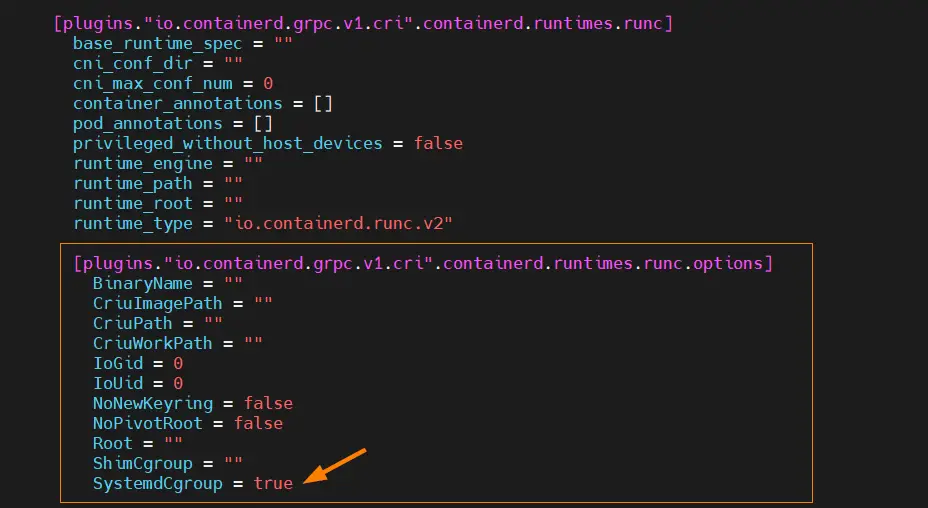 Отредактируйте файл « /etc/containerd/config.toml » и найдите раздел « [plugins».io.containerd.grpc.v1.cri».containerd.runtimes.runc.options] и измените « SystemdCgroup = false» на ‘SystemdCgroup = true ‘