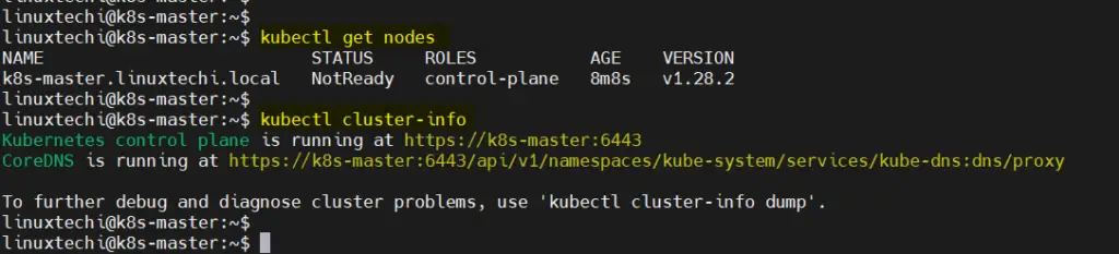 Запустите следующую команду kubectl, чтобы получить информацию о нодах и кластере: